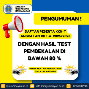[PENGUMUMAN] DAFTAR PESERTA KKN-T ANGK. XII T.A. 2025/2026 DENGAN HASIL GENERAL TEST DI BAWAH 80%